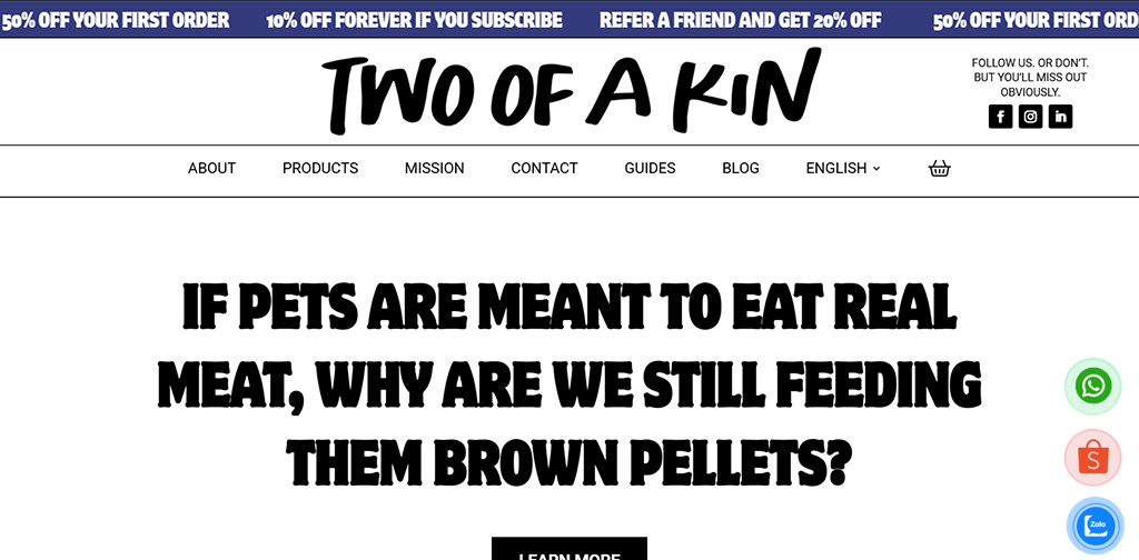 A bold and purpose-driven e-commerce website built for Two of Kin, a modern pet nutrition brand challenging traditional pet food with a strong educational and storytelling approach.