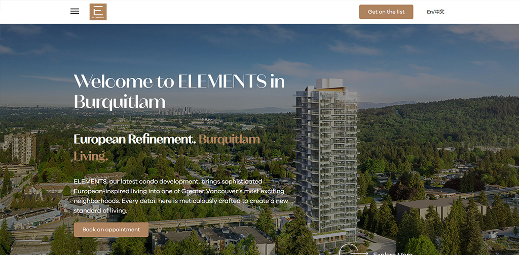 A custom property showcase site for a high-end Vancouver-area residential project, designed to highlight lifestyle details, amenities, and registration leads.