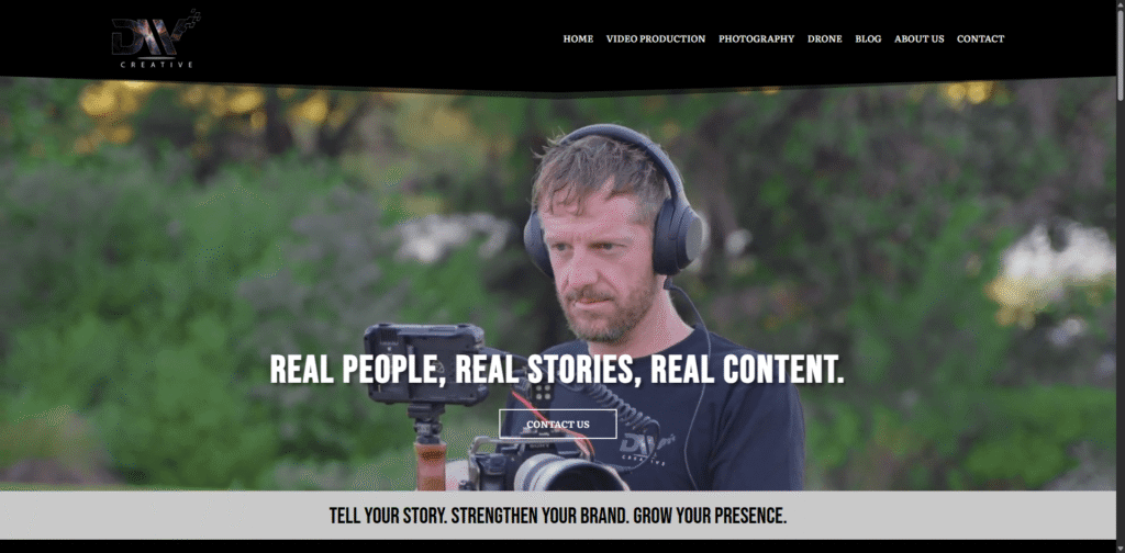 A dark-themed, cinematic WordPress portfolio for a professional videography and photography studio, optimized for high-resolution media playback and client inquiries.